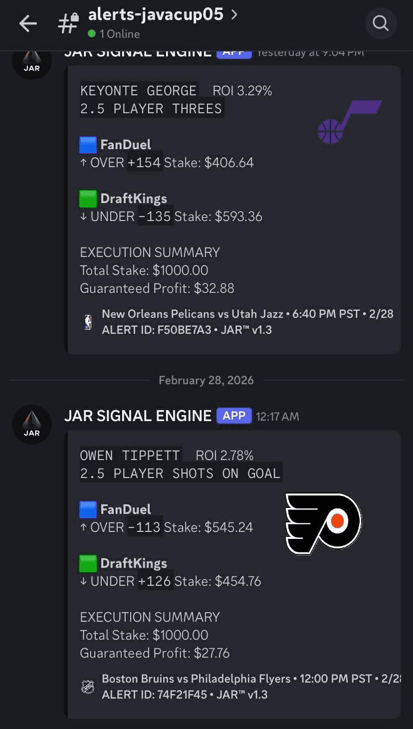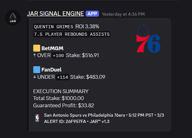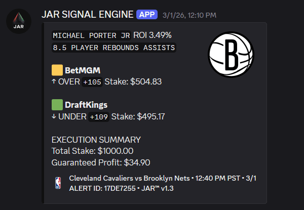 JAR™ is designed to suppress those moments. Alerts surface only when both sides of a market are live, verifiable, and executable at the same time — not when a theoretical edge briefly appears.